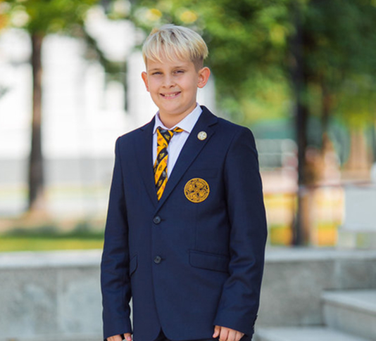 Для мальчиков это темно-синие брюки и пиджак классического кроя, белая рубашка и черно-желтый галстук, установленного Гимназией образца. Для старшеклассников (8-11 классы) цвет галстука определяется выбранным профилем обучения (Экономика — α, Политика и право — β, Естественные науки — γ, Филология — δ).